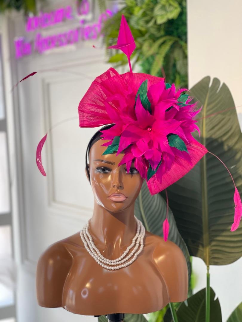 All of our Fascinators are one size fits all and worn on a big band, or medium-size band, ribbon-covered metal or plastic.